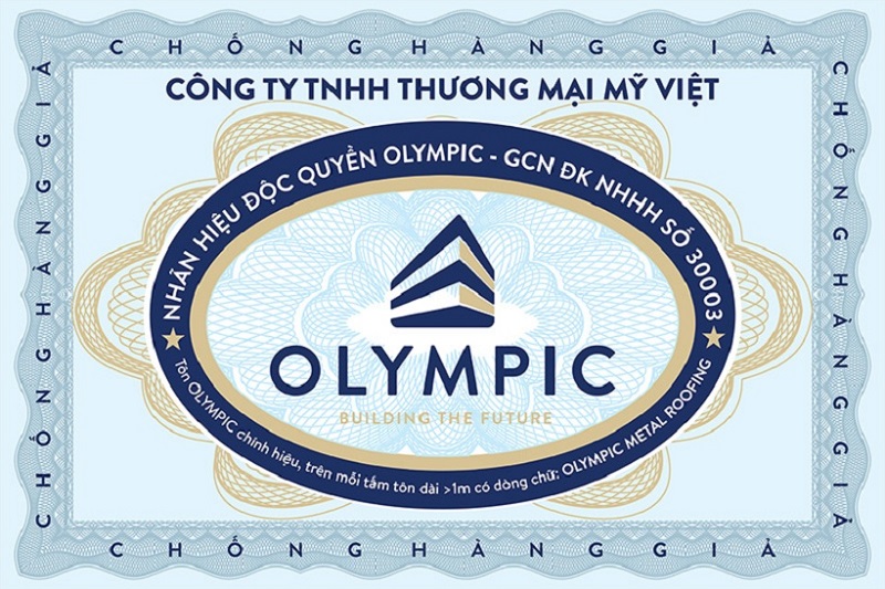 Với những tấm tôn Olympic đạt tiêu chuẩn từ nhà sản xuất Mỹ Việt đều được dán logo, dán tem chống hàng giả trên tất cả bề mặt tôn. Tem có màu xanh nổi bật kết hợp với logo tôn Olympic và tên nhà sản xuất in rõ ràng giúp quý khách có thể dễ dàng nhận biết.